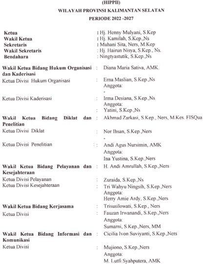 Berikut struktur organisasi HIPPII (Himpunan Perawat Pencegahan & Pengendalian Infeksi Indonesia) Wilayah Provinsi Kalimantan Selatan periode 2022 sampai dengan 2027.